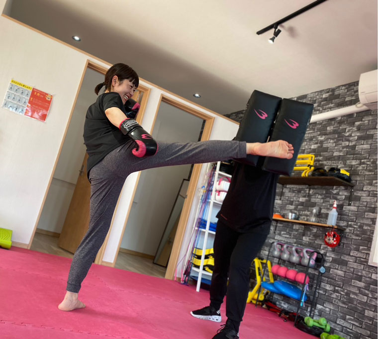 パンチは肩・胸・腕を使い、キックはお尻や太もも、ふくらはぎをフル稼働。さらに常に動き続けるフットワークが加わるため、全身を均等に使うことになります。