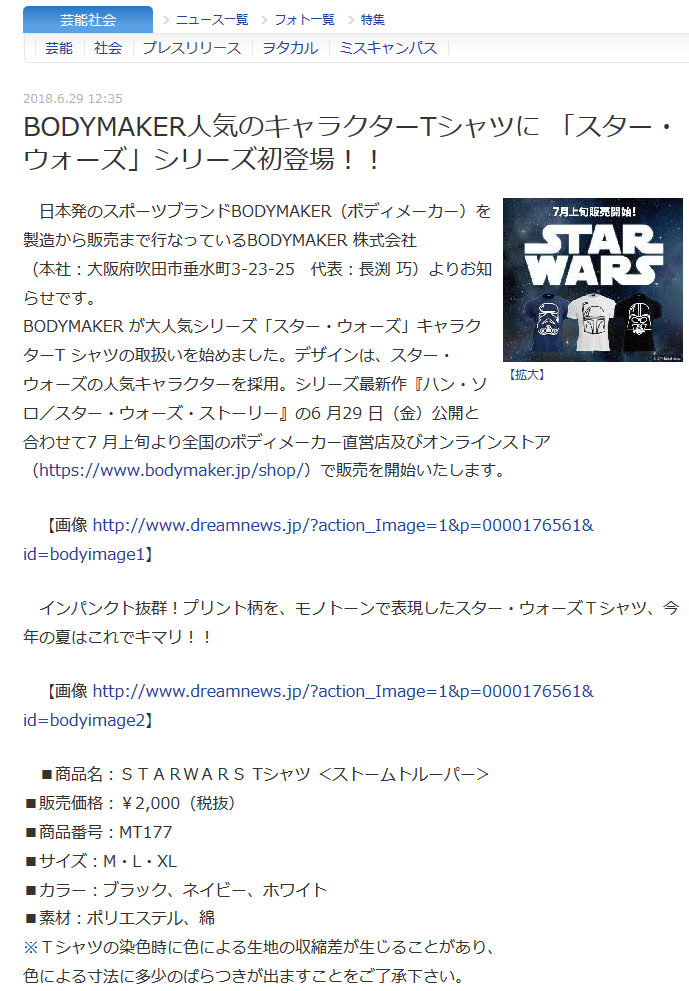 2018年6月29日 「SANSPO.COM」に「BODYMAKERに”スター・ウォーズ”シリーズ初登場」に関する記事が掲載されました。