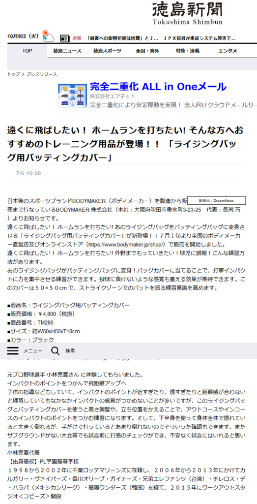 2018年7月6日 「徳島新聞」に「元プロ野球選手推薦の飛距離アップ商品、ライジングバッグ用バッティングカバー」に関する記事が掲載されました。